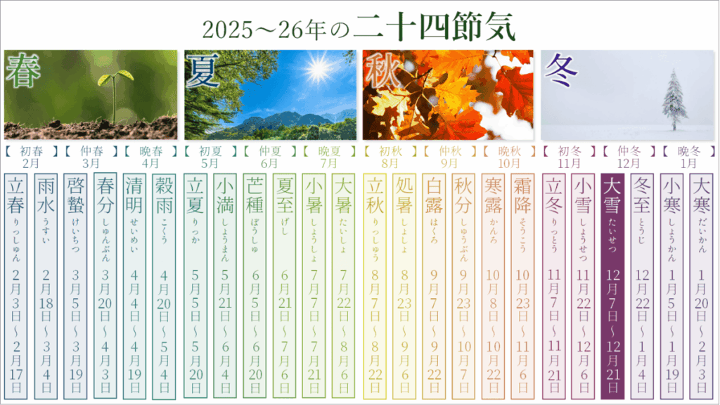 大雪は冬の3番目の節気で、2025年は12月7日~12月21日。