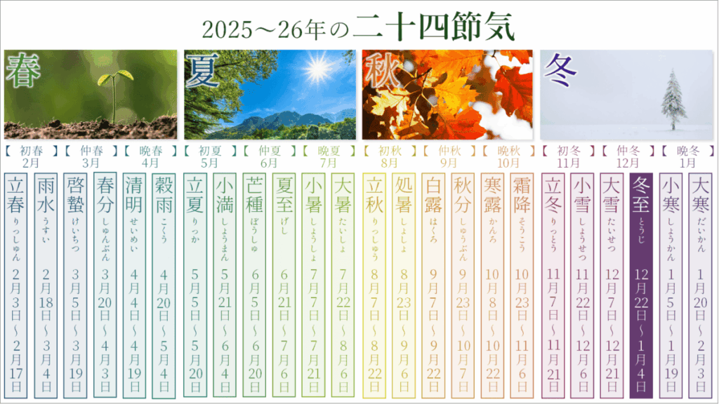 2025年12月22日~2026年1月4日は、冬の4番目の節気である「冬至(とうじ)」。